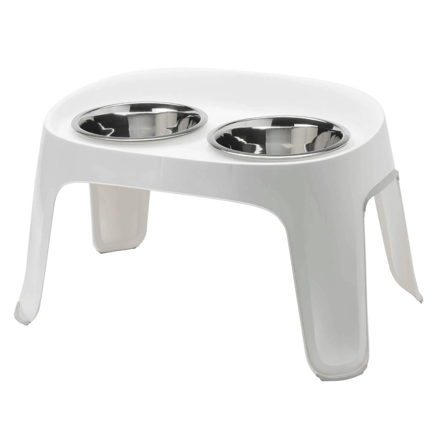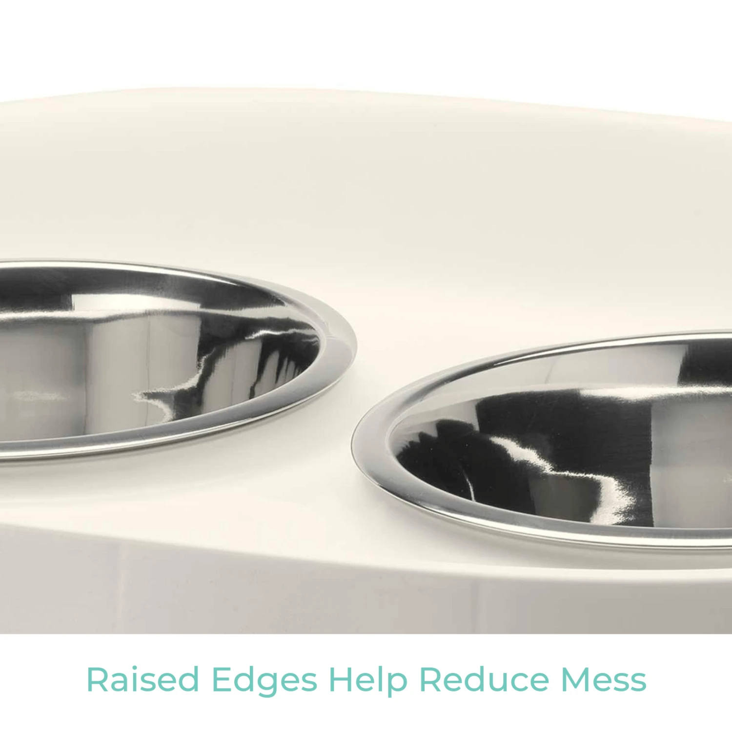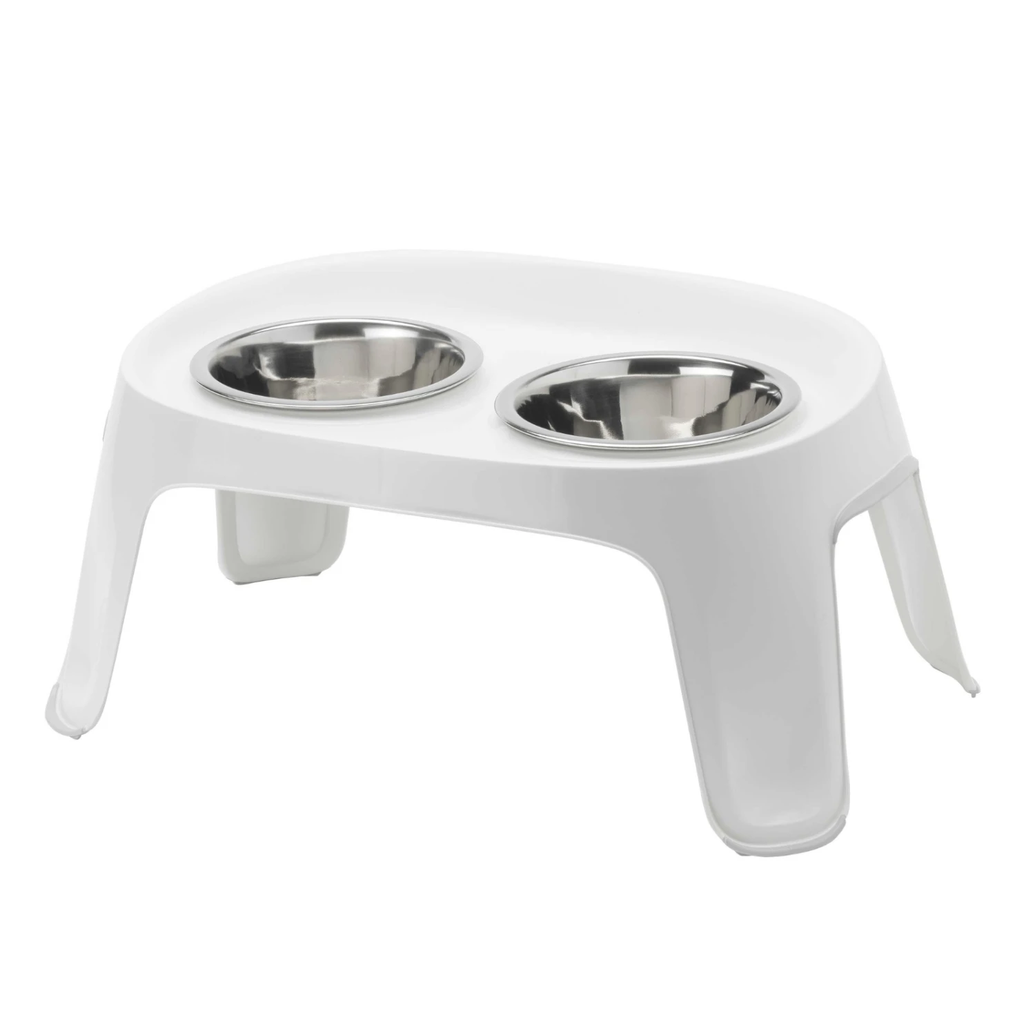 The raised edges will keep your dog’s mess to a minimum and the stand features noise-softening inserts made of rubber that will keep those bowls even more firmly in place. The bowls themselves are stainless steel, making them a breeze to clean; as for the stand, it’s also an easy clean; made with a stable and thick plastic construction to support your dog’s food and water and the weight he puts on the bowls as he eats.