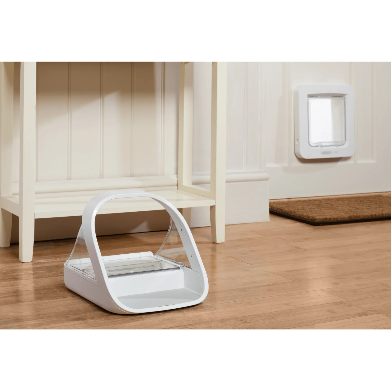 The Microchip Pet Feeder has been designed to recognise either the microchip already implanted in your pet or the Sure Petcare RFID Collar Tag (one included – packs of two sold separately), allowing your pet to access their food whilst keeping out other animals. Designed for use in multi-pet homes, the feeder will recognise authorised pets opening only for them. If an unauthorised greedy or bully pet tries to eat from the bowl it will not open, or if the feeder is already open the lid will close. The SureFeed bowls have an integrated seal on the top lip. This has been designed so that once the lid of the feeder is closed a seal is formed with the top of the bowl, keeping your pet’s food fresher for longer.